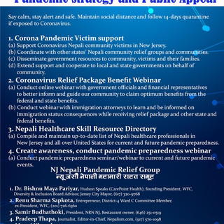On March 27, 2020, Nepali community representatives from New Jersey State conducted conference call meeting to stay informed and prepared for current Coronavirus and future pandemic preparedness. After comprehensive discussion, Nepali representatives had decided to establish a pandemic preparedness group: “NJ Nepali Pandemic Relief Group” (न्यू जर्सी नेपाली महामारी राहत समूह)