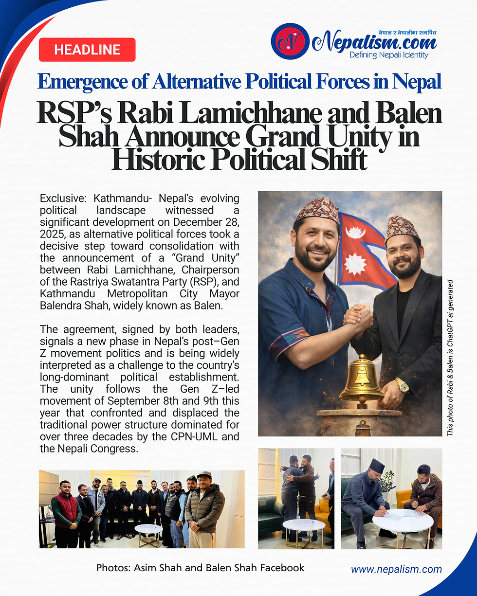 Exclusive: Kathmandu— Nepal’s evolving political landscape witnessed a significant development on December 28, 2025, as alternative political forces took a decisive step toward consolidation with the announcement of a “Grand Unity” between Rabi Lamichhane, Chairperson of the Rastriya Swatantra Party (RSP), and Kathmandu Metropolitan City Mayor Balendra Shah, widely known as Balen.